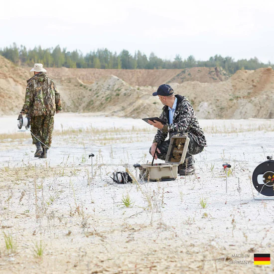 Are you looking for underground water resources or hidden cavities up to depths of 250 meters (820 ft)? GeoSeeker is a professional geoelectrical water detector and cavity detector that measures the ground resistivity and visualizes its scan data in incredible 3D graphics. It is a very mobile and easy to operate geoelectrical detector designed and manufactured in Germany.